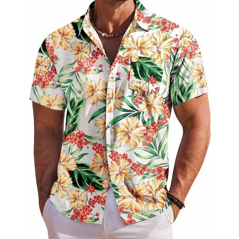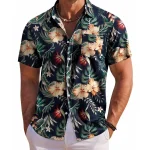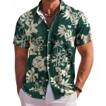 Men’s Button Down Shirt with Pocket Flower Plant Print Short Sleeve Turn Down Collar Casual Tops for Beach& Daily Life