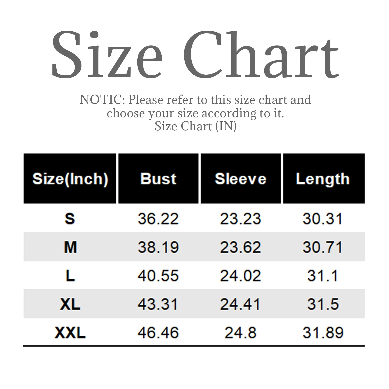 | Size | Bust | Sleeve | Length |