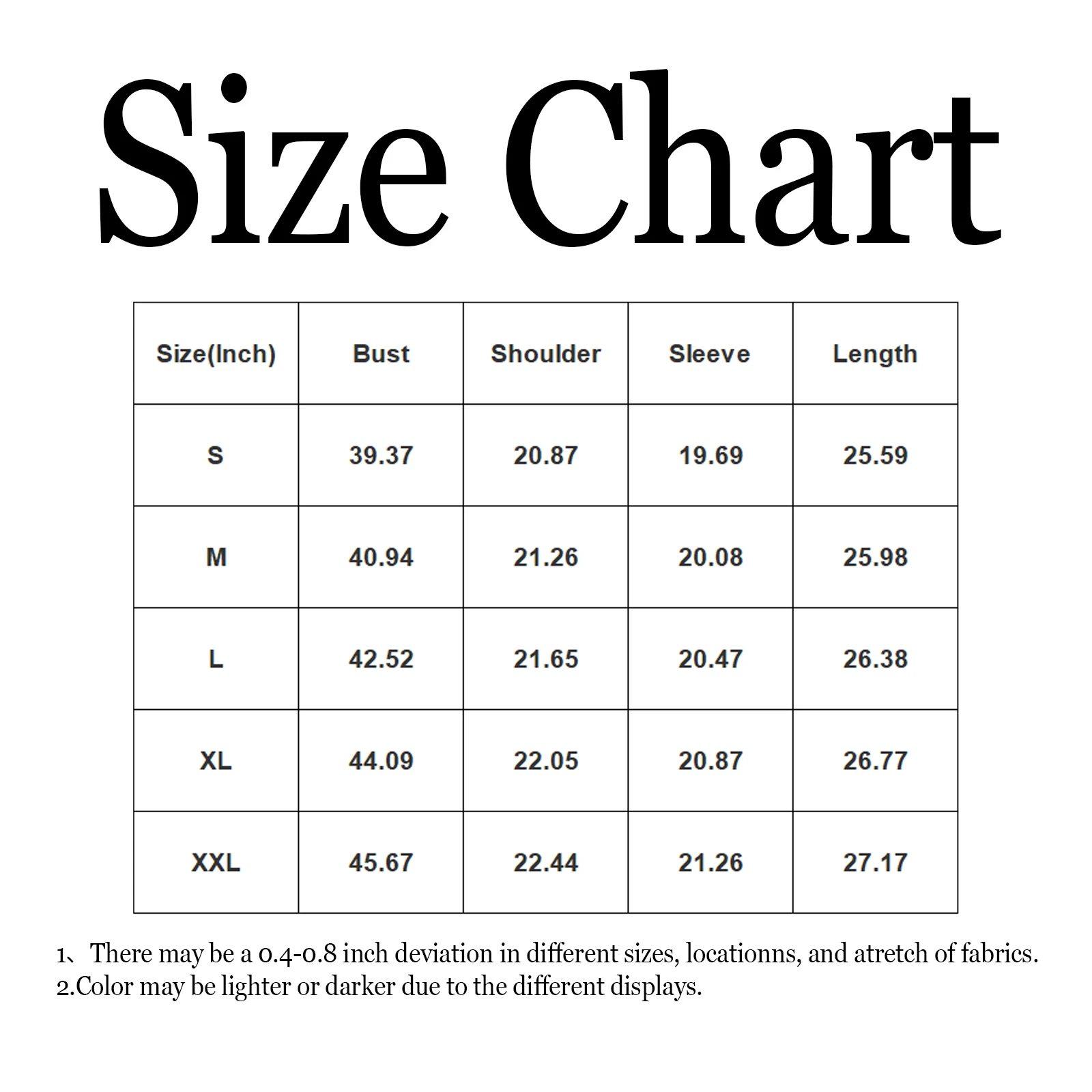 | Size | Bust | Shoulder | Sleeve | Length |