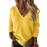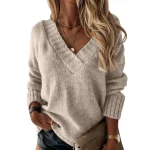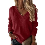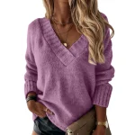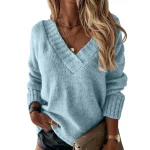 Women’s Solid Color Sweater Women’s V-neck Long Sleeved Pullover Sweater Top